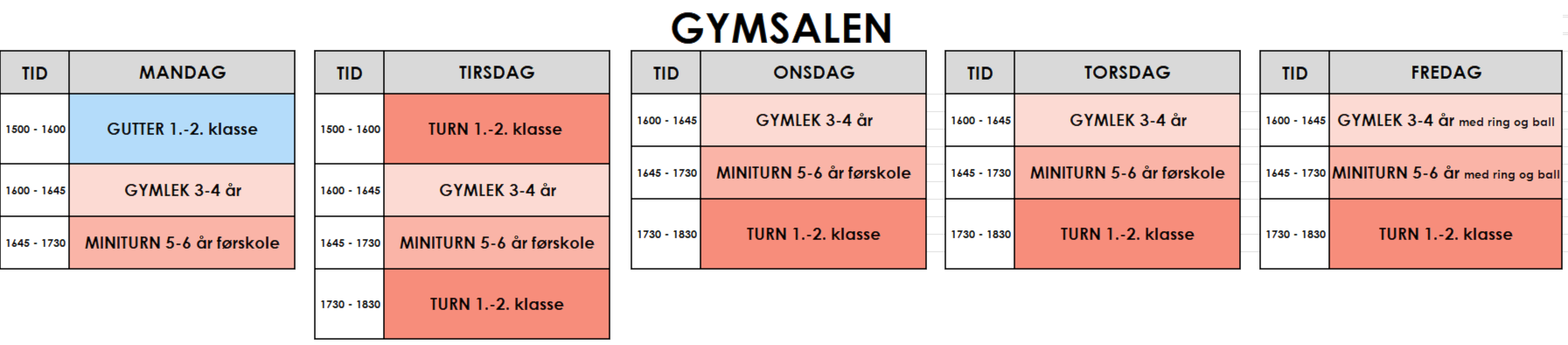 1. Gymsalen er hovedhallen til Turn 1.-2. klasse. Gymsalen har inngang til høyre for hovedinngangen på den øvre parkeringsplassen. Oppmøte til trening er ved døren til Gymsalen.