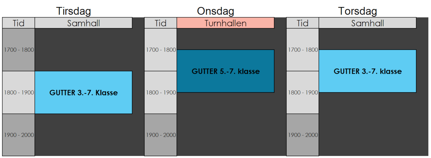 - Onsdag + torsdag 1730-1830 gutter (5.-7. klasse)